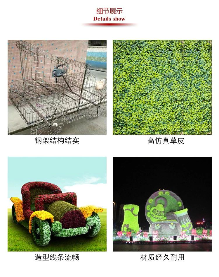 首先,仿真植物綠雕采用高質(zhì)量的仿真材料,具有抗氧化、抗UV, 防輻射等特點,仿真植物不用考慮水分、空氣、溫度等自然因素,因此植物綠雕受環(huán)境影響小,使用時間長,便于維護;其次,仿真植物色彩形狀的選擇性更多,雕塑造型可塑性強,可以做出各種各樣的造型,是對真植物五色草品種及顏色不足的補充;